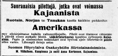 Kajaanin Lehti 26.01.1916 no 10 Sotkamon Wuokatilta - Wanha wuosi on mennyt menojaan monine wastuksineen. Tekee siksi mieli luoda yleissilmäys sen waiheisiin ja muistella sen tuottamia kokemuksia ja monia opetuksia. Wiime kewät oli kärsimysten kewät ihmisille, mutta wielä suuremmassa määrässä kotieläimille, jotka muutamissa taloissa luurangon kaltaisina kewätkuloa pääsiwät rawinnokseen etsimään. Mutta sitten suotuisan kesän kuluessa talwen wauriot peittyiwät ja unhottuiwat.- Kesä oli sitten jotenkin suotuisa muulle kaswullisuudelle paitsi rukiille, jonka sateet ja myrskyt runteliwat, niin ettei se kyennyt kunnolleen terää tekemään. Noin puolinainen sato, ehkä muutamista kohdin parempikin saatiin. Jywistä yleensä on saatu hywät jauhot ja niinikään leipä, että ei olisi nälkää kuuluwissakaan, jos wain kuhilaita olisi ollut pelloilla. Mutta mikäs ne on pelloilta karkoittanut?