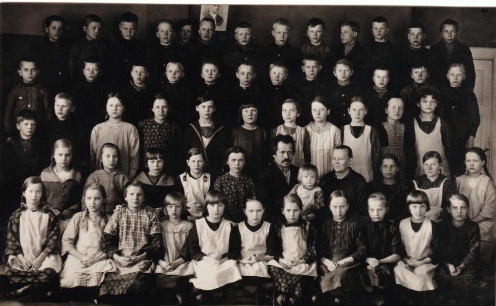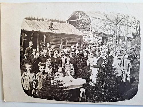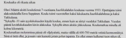 Ja niin alkoi koulutieni, kävin 2 viikkoa pientenkoulua. Kyllä oli hauska kun tehtiin viholaissäkistä laukku, johon itse merkkasin nimikirjaimeni. Opettajalla oli 4 luokkaa samassa luokassa. Meitä oli 98 oppilasta ja kun muilla luokilla, joissa oli nelisenkymmentä oppilasta, oli silloin muita aineita kun I - 2 luokat kirjoittivat. Muistan, että ensimmäinen talvi oli oikein ankara lumi- ja pakkastalvi, että piti juosta aina vähän matkaa ja sitten käsillä polvia lämmittää, kun sukanvarret eivät ylettyneet kuin polviin asti, josta ne oli sidottu. Kyllä minulla housutkin oli, mutta kolmen kilometrin taipaleella kerkisi paleltaa. Ja ankarimpana pakkasaikana oltiin koulun pirtissä öitä, pojat nukkuivat ovensuussa ja perällä viholaispatjan päällä tytöt oma takki peittona.- Muistan kuinka monta kertaa opettajan piti tulla kieltämään meitä, kun valo sammutettiin. Silloin pojat ryömivät meitä varpaista vetämään, mutta se tuntui, että aivan henki lähtee, niin pelotti kun opettaja tuli kieltämään. - Liistereelläkin meitä kuljetetti joskus naapurin Heikki- isäntä tai oma isä. Jos joskus isällä ei ollut hevosta aisoissa, kun oli ranteella, niin monta kertaa hän tuli riihen taakse asti tietä polkemaan. Oli monta kertaa kun astuin isän askeleihin itku kurkussa, kun niin hävetti kun en pääsyt yksin, vaan isän piti tulla auttamaan. Muistan monta kertaa, kun en uskaltanut katsoa taakseni, jotta isä ei näkisi itkuani ja koetin vakuuttaa, että kyllä minä isä nyt jo pääsen.