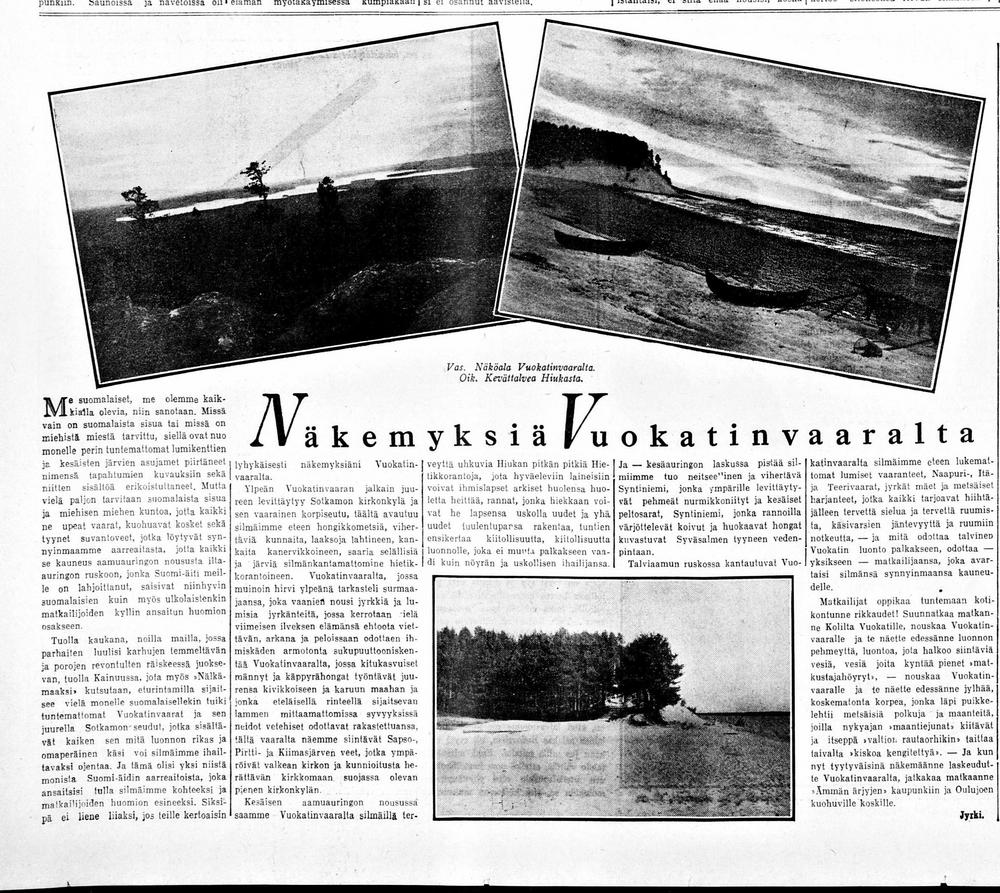 Kävimme juhannussaunassa ja nautimme väärentämättömästä maalaisilmasta, voimakkaista maalaismaisemista ja koko olemassaolostamme. Ja makealle maistui uni juhannusyönä. Ei vähääkään haluttanut ulos sateeseen. Juhannusaamuna heräsimme lintujen liverrykseen ja nähdessämme akkunasta kappaleen sinistä taivasta olimme heti jalkeilla. Koko aamupäivä kului ihmetellessä tuttujen seutujen uudistunutta ihanuutta. Pihlajat tuoksuivat vaaran rinteellä. Järvi kuvasteli peilityynenä lukuisia saariansa. Monivivahteinen vihreä peitti laajat peltoaukeat. Käen kukunta ja pikkulintujen liverrys kuului ympäröivistä metsistä. Ja tuolloin tällöin nousi peltojen keskeltä kiuru, kohosi laulaen pyörryttäviin korkeuksiin, jonne silmä sitä tuskin jaksoi seurata, ja kiiti sitten nuolena alas pesäänsä. Talon räystäitten alla olevien kymmenien pääskysenpesien asukkaat risteilivät viserrellen ilmassa, ja kun keksimme tarjota niille höyheniä pesän pehmustamiseksi, oli niiden kiitollisuus rajaton. Tirskuttaen ne kaartelivat ympärillämme, niin että siivet melkein kasvoja hipaisivat, sieppasivat taitavasti höyhenen nokkaansa, kiidättivät sen pesään ja kiiruhtivat heti hakemaan uutta. Koko piha tuntui olevan täynnä siipien havinaa ja iloista viserrystä. Kun taivas yhä kirkastui, nousimme pyörien selkään ja lähdimme kohti Vuokattia, tai oikeammin sitä Vuokatin huippua, jota tavallisesti tällä nimellä mainitaan.- Vain kerran ajoi kuuropilvi meidät kuusen alle, mutta muuten oli sää mitä herttaisin. Ei kannata yrittää kuvailla Vuokatin näköaloja, siihen eivät sanat riitä. Ja sitä paitsi ne tuntee jokainen kainuulainen omien silmiensä perusteella. Vai tunteeko? Siellä tapasimme miehen, joka tiedoillaan sai meidät aivan pyörälle päästämme, mutta siitä ja muusta Vuokatilla tapahtuneesta lienee parasta puhua oikein erikseen. Viivyimme siellä vaaran päällä kokonaista viisi tuntia, näppäilimme kuvia ja ihailimme kaunista Kainuuta. Sitten illalla kotiuduttuamme alkoi jälleen sataa. Mutta, nyt me olimme turvassa ja lepo tuntui suloiselta. Katselimme, kuinka kylän nuoriso riensi juhannustansseihin parhaissa kesähepenissään ja jäimme kiltisti kotimiehiksi. Työ kutsui toverini kaupunkiin jo seuraavana päivänä, mutta minulle jäi vielä kaksi ihanaa päivää.