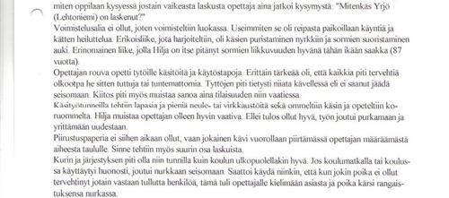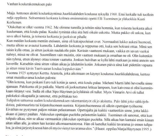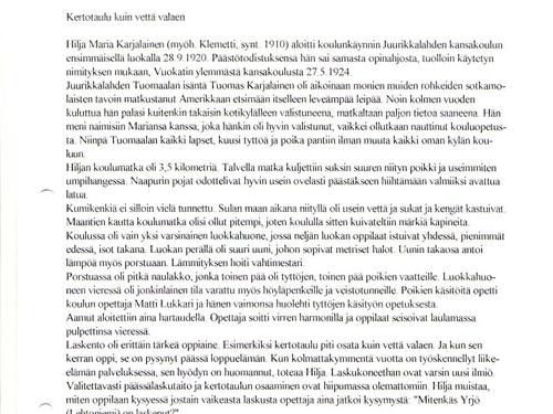 "Pääsin 9- vanhana pikkukouluun ja siitä hyväksyttiin kansakouluun. - Olin jo monta vuotta osannut lukea. Isäni oli hyvä kirjoittamaan ja hän luki mitä käteensä sai, kaikki poikain koulukirjatkin. Muistan kun veljet kävivät koulussa, ei heillä ollut vielä vihkoja, mutta sellaiset kivitaulut, johon kivisellä kynällä kirjoitettiin ja aina pyyhittiin pois. Ja voi onneton sitä, joka halkaisi sen taulun. - Muistan kuinka ajattelin pienenä, että luen, niinkuin sitten isältä opin. Kova halu oli kyllä ja aina koetin veljeltäni kysyä sanomalehdestä, että mikä kirjain tuo on, mutta hän suuttui kovin jos kysyin toiseen kertaan. Ja se g tahtoi olla niin vaikea, koetin minä piirtääkin sitä hiilellä, että pysyisi paremmin mielessä, mutta ei. Kerrankin oli puuseppä saavia tekemässä ja minä sitä g:tä piirsin niihin lautoihin. Kun hän sanoi, että voi sinä tytön pahus, pilaat minun lautani ja niin sekin piti lopettaa.