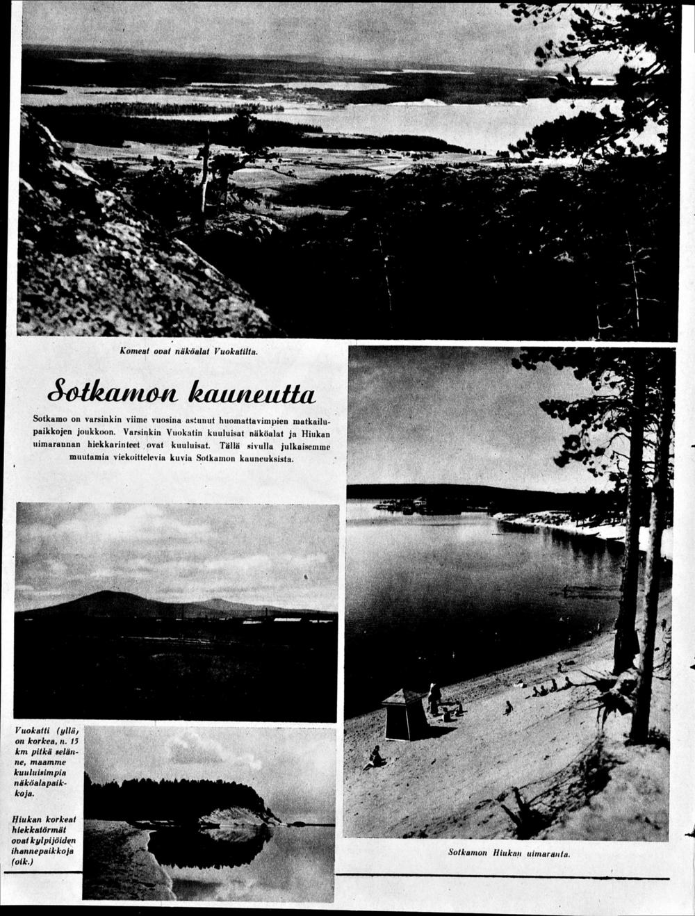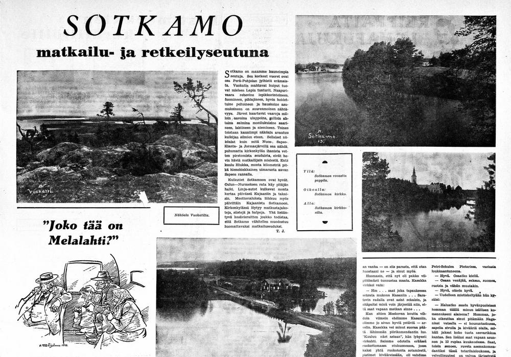 " Kainuun hotellien ylpeys","Sotkamon ihanien ja välkkyvien vesien saartaman kirkonkylän keskessä kohoava Tikkasen puoleensa vetävä kaksikerroksinen matkailuhotelli.- Ennen sanottiin, että ”ihanin maailmassa on Japanin kevät, eikä missään oo niin lysti olla kuin Lahden tatsuunalla”, mutta minä väitän, että silloin ei tiedetty mitään Hiukan rannasta eikä Tikkasen hotellista.- Kohtelu Tikkasen hotellissa on aina erinomainen ja matkustaja saa jo ensi hetkestä mieluisan tunnelman, mutta tällä kertaa sattui yksi poikkeus, sillä meidän yörauhaamme häirittiin pahasti. Saimme kookkaan huoneen ja paneuduimme iltamyöhällä levolle kolmeen rinnakkaiseen sänkyyn kuin kasarmilla konsanaan. Juuri kun olimme nukahtamaisillamme kuului pieni naputus ja oviverhojen aukosta työntyi esiin iso tarjotin höyryävine teelaseineen sekä ihanine hyötymansikoineen. - Lehtori Lounela siristi silmiään ja minä pukkasin sitä turkulaista maisteria kylkeen ja sanoin entiseen pohjalaiseen tapaan, "että nouse kahtomaan henkes lähtöä". Ja maisteri nousi ja säikähti ja sanoi, "että mistä on kysymys", johon vastasin, että nyt on kysymys siitä, miten täällä Pohjolan Kainuussa matkustajia kohdellaan". Tuoja itse oli omistajatar, livahti pois ja maisteri vilkuili tarjottimeen. Yllätys oli ilmeinen ja kuulin maisterin supisevan, ettei tällaista siellä etelässä tapahdu. Minä myönsin ja huomautin, että nyt ollaankin Pohjolassa ja lisäksi vielä – Sotkamon Tikkasessa. - Iltauni oli mennyttä, iloinen mieliala virisi ja kesäyön valo tunkeutui hehkuen ja värjäävänä huoneemme soppiin. Vasta kello kolmen seuduilla heittäydyimme uudelleen unen valtaan ja se turkulainen kuiskasi minulle epäilyksensä, jos vielä uusi yllätys sattuisi. Puolestani huomautin, ettei se olisi lainkaan ihmettä, sillä täällä Kainuussa on hyvää väkeä, jonka kohteliaisuuteen ja ystävällisyyteen ei liity mitään itsekästä tarkoitusta eikä imartelua. Maisteri pudisti päätään ja ihmetteli selittäen, ”että etelässä voi kuolla raha kourassa nälkään”, toisin sanoen siellä ei rahallakaan saa ruokaa, vielä vähemmän sellaista ystävällisyyttä, johon ei sekaantunut omanvoitonpyyntöä.