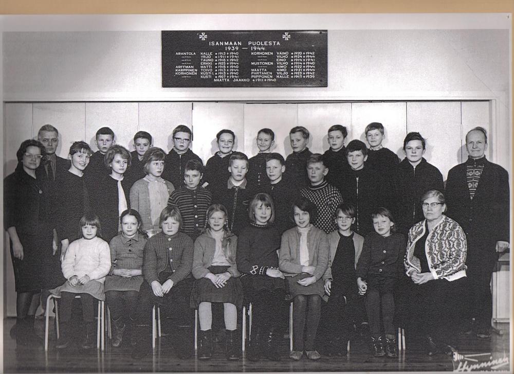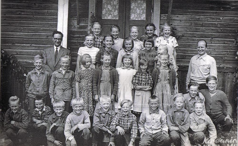 Sitten päästiin päivän töihin, jokainen jonnekin, minä 1952 ensimmäiselle luokalle kouluun Markkoon, toinen luokka Kaikkolassa ja sitten päästiin uuteen koulurakennukseen, jossa oli luokat alakoululle ja yläkoululle.