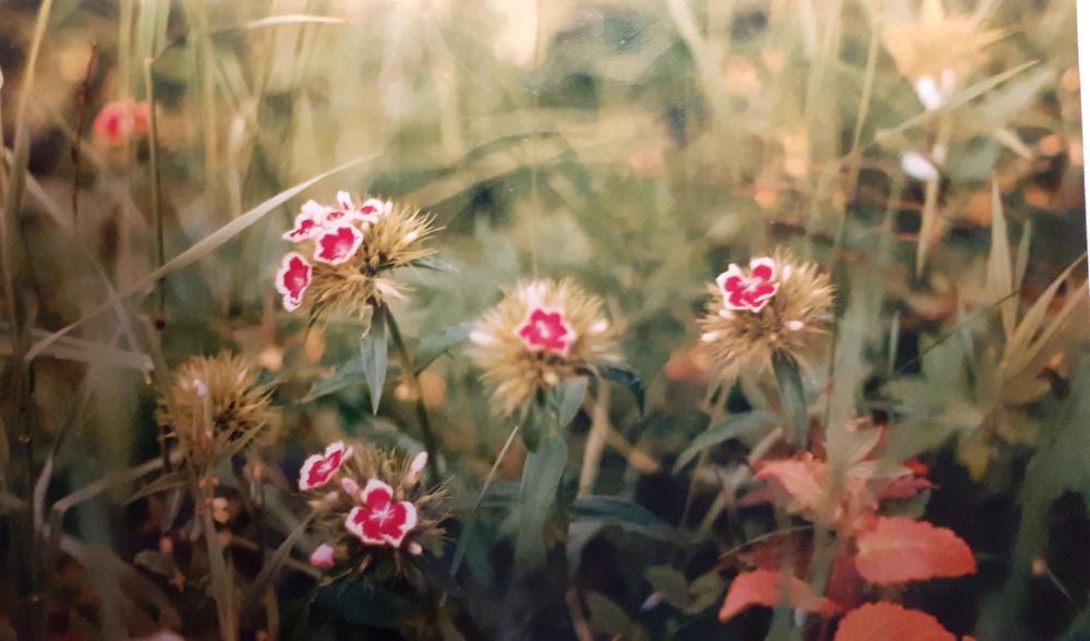 Kasvimaa laitettiin alkukesästä. Oli sipulia, kaalia, porkkanaa, hernettä, naurista, punajuurta ja tietysti kukkapenkki kesäkukkia varten. Penkit tehtiin äidin ohjeen mukaan tietyn levyiseksi, välit polettiin jaloilla kulkuväyliksi. Sitten pitkällä narulla (ihminen kummassakin päässä) merkittiin vaot, joihin siemenet kylvettiin. Kasvimaa näytti oikein hienolta, kunnes rikkaruohot alkoivat nostaa päätään. Oli meillä monivuotisia kukkiakin, osa mummun laittamia ja osa äidin kotoaan tuomia.