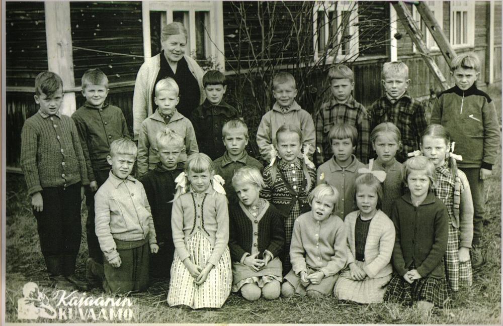 Ja niin alkoi koulutieni, kävin 2 viikkoa pientenkoulua. Kyllä oli hauska kun tehtiin viholaissäkistä laukku, johon itse merkkasin nimikirjaimeni. Opettajalla oli 4 luokkaa samassa luokassa. Meitä oli 98 oppilasta ja kun muilla luokilla, joissa oli nelisenkymmentä oppilasta, oli silloin muita aineita kun I - 2 luokat kirjoittivat. Muistan, että ensimmäinen talvi oli oikein ankara lumi- ja pakkastalvi, että piti juosta aina vähän matkaa ja sitten käsillä polvia lämmittää, kun sukanvarret eivät ylettyneet kuin polviin asti, josta ne oli sidottu. Kyllä minulla housutkin oli, mutta kolmen kilometrin taipaleella kerkisi paleltaa. Ja ankarimpana pakkasaikana oltiin koulun pirtissä öitä, pojat nukkuivat ovensuussa ja perällä viholaispatjan päällä tytöt oma takki peittona.- Muistan kuinka monta kertaa opettajan piti tulla kieltämään meitä, kun valo sammutettiin. Silloin pojat ryömivät meitä varpaista vetämään, mutta se tuntui, että aivan henki lähtee, niin pelotti kun opettaja tuli kieltämään. - Liistereelläkin meitä kuljetetti joskus naapurin Heikki- isäntä tai oma isä. Jos joskus isällä ei ollut hevosta aisoissa, kun oli ranteella, niin monta kertaa hän tuli riihen taakse asti tietä polkemaan. Oli monta kertaa kun astuin isän askeleihin itku kurkussa, kun niin hävetti kun en pääsyt yksin, vaan isän piti tulla auttamaan. Muistan monta kertaa, kun en uskaltanut katsoa taakseni, jotta isä ei näkisi itkuani ja koetin vakuuttaa, että kyllä minä isä nyt jo pääsen.