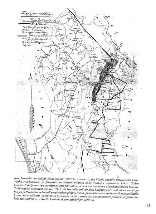 2. Vesiteistä maanteihin - Tähän alkuun voisi lisätä kertomuksen Sotkamo-nimen synnystä. joka julkaistiin Uusi Suometar-lehdessä 16.10.1874 no 121 — Mistä Sotkamo on nimensä saanut? U. S:n 47 numerossa oli Mallasweden ja 92 n:rossa Haukiweden synnyt mainittu. Saataneempa siis „Sotkamonkin" syntymänimi ilmoittaa. Tämän nimen todistawatkin luonnolliset syyt kukaties todeksi. — Ensin täytyy tehdä wähäinen selwitys Sotkamon asemasta, jos mieli saada tämä nimi selwille. Oulujärweltä ylöspäin noustessa, Sotkamon pitäjän keskipaikoilla, kääntyy Sotkamon wesistö tasawinkkeliin pohjoista kohti kulkemaan; toinen lyhempi haarawesistö (nimeltä Sapson wesistö) kääntyy sitä wastaan winkkeliinsä etelää kohti kulkemaan.- Nämä molemmat wesistöt toisistaan erotessa owat niin saarilla ja kaitaisilla salmilla sotketut ja mutkaiset, että se on oudolle matkustajalle aiwan luonnotonta, että pohjoista kohden kulkewa wesistö ylettyy pidemmälle. Näitten wesistöhaarojen wäliä edelleen päin, ja siis yhtä suuntaa Oulujärwestä tulewan pääwesistön kanssa, nousee wielä erittäin, muutaman kolmen wirstan pituinen wesistö, joka matkasuunnan mukawuudella wiehättää matkustajan puoleensa; tämän wesistön päässä, noin muutama wirsta wesistöjen ristiyksestä, aukenee noin kahta wirstaa pitkä ja puoltatoista wirstaa leweä järwi, jota nyt sanotaan Sotkamo-järweksi. — Tämmöinen on nyt keskusasema wesistöjen suhteen Sotkamossa. Siis nyt kansan suussa säilynyttä Sotkamon nimi-tarua selwittämään: